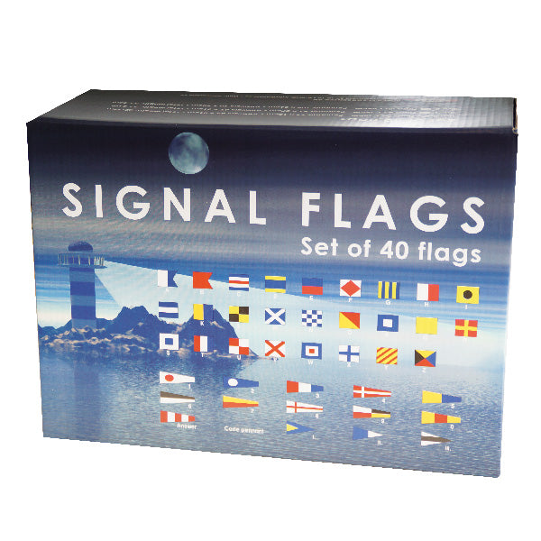 Komplet signalflagsæt bestående af 40 stk. signaler (bogstavsflag, talvimpler, svarvimpel og lighedsstander). Opbevaringsposen er markeret så man let kan få det rigtige flag tilbage på plads. Levereres i fin gaveæske.