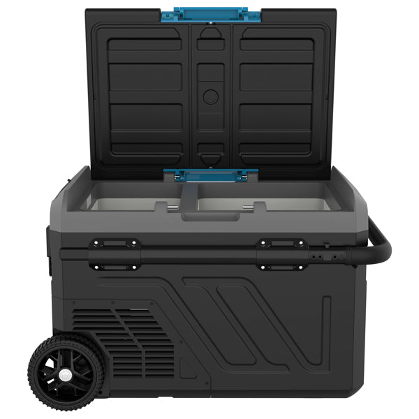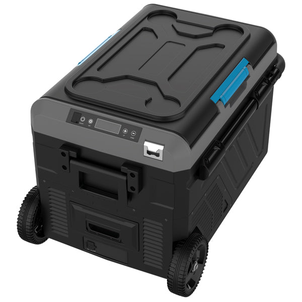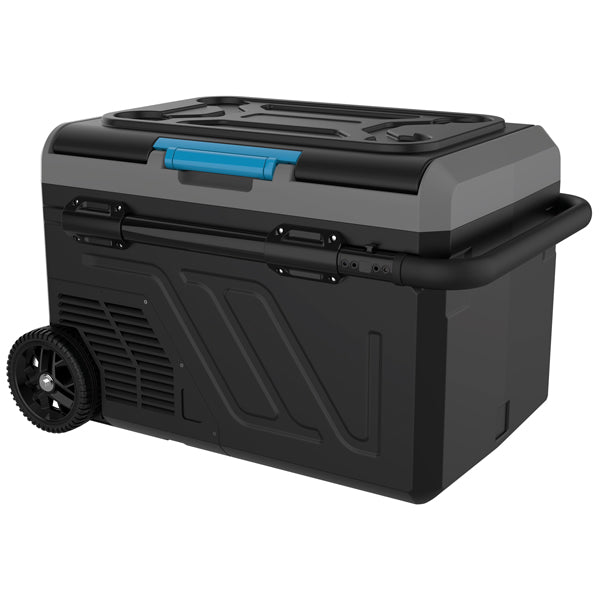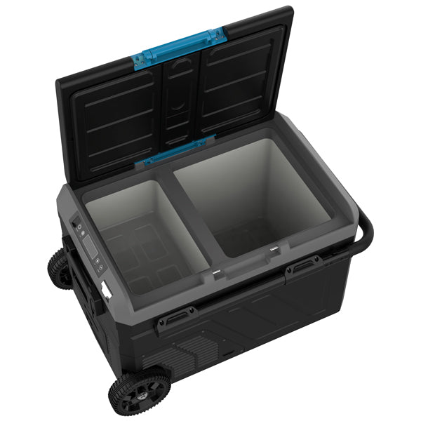Icebergs 40-liters køleboks med hjul er en fremragende boks til ture, hvor du vil tage frisk mad, kolde drikkevarer og is med dig. Boksen har kraftige hjul og en udtrækkelig rullearm, hvilket gør den nem at tage med, selv når den er tungt lastet. Den har to zoner, hvor temperaturen kan styres individuelt via det brugervenlige display eller via en app på din telefon (bluetooth). Du kan vælge temperaturer fra +20 °C og ned til hele -20 °C (tom boks) og have forskellige temperaturer i de to zoner.
