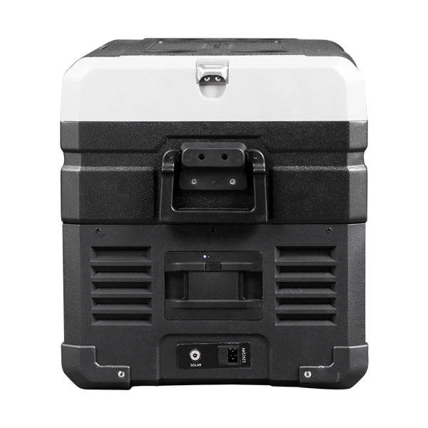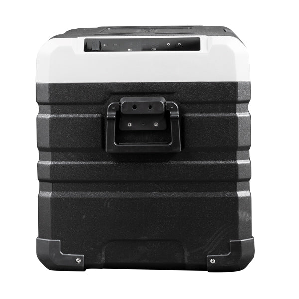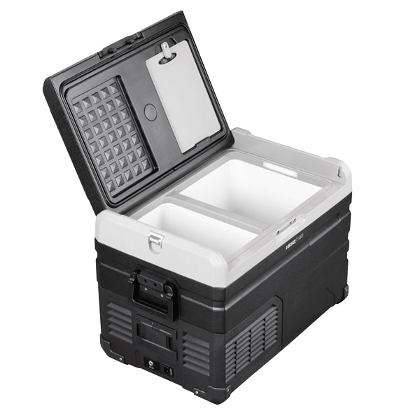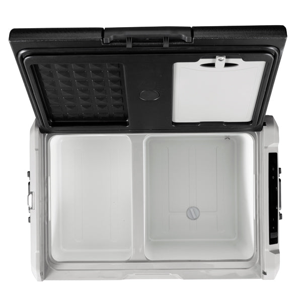 Køleboksen er med dobbelt zone. Udstyret med kraftige bærehåndtag og display, som viser temperatur. Låg kan åbnes til begge sider. Med LED lys, som tændes, når låget åbnes.