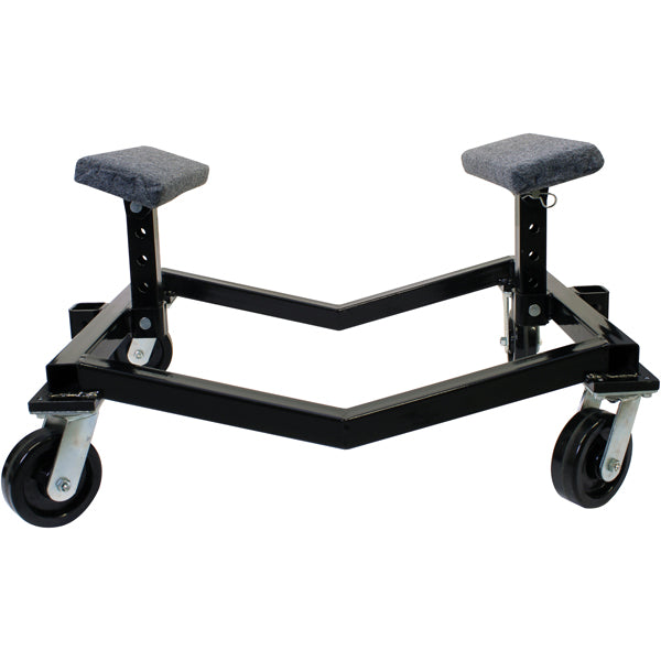 Bådvogn i sort lakeret stål med tæppebelagte støtter.