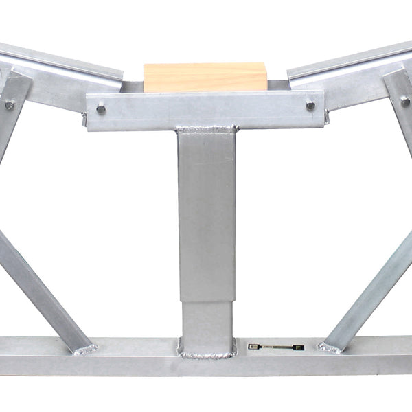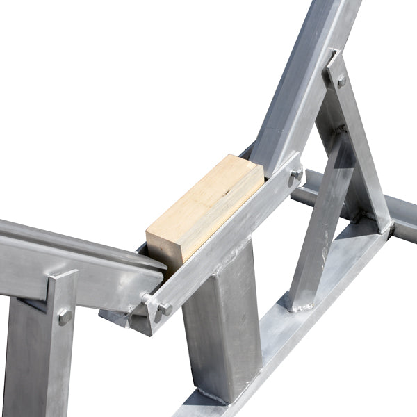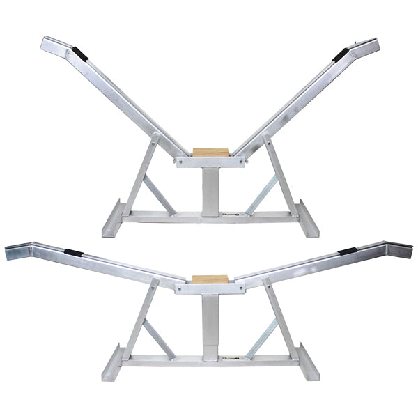 Selvjusterende motorbådsstativer i saltvandsbestandig aluminium. Bukken tilpasser sig automatisk skrogets vinkel ved at hæve kølblokken, når sidevæggene skubbes ud. Gummibeklædningerne på skovlene kan nemt skubbes til kontaktpunkterne mellem skovle og skrog.
