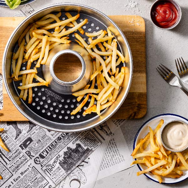 Keramisk nonstick-belægning gør, at intet sætter sig fast. Små huller sikrer, at intet falder ned. Perfekt til pommes frites.