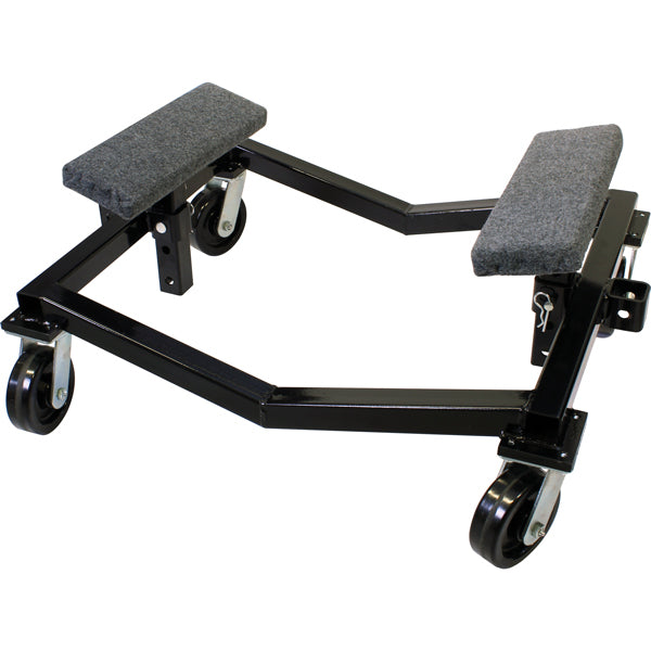 Bådvogn i sort lakeret stål med tæppebelagte støtter.