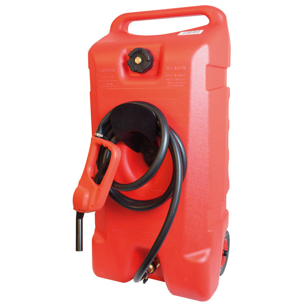 · Ingen tærende dele · Stærk, kan modstå stød · Monteret m/3 m slange · 15 cm plastik hjul · Benzin og diesel · EN 10168:2004 og CE godkendt