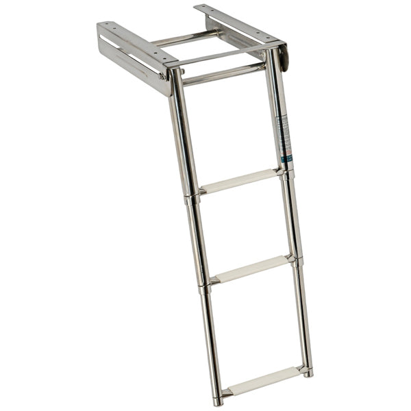 Fremstillet af rustfrit stål og ovale trin med skridsikker hvid plastbelægning. Teleskopstigen kan foldes ind i kassetten som er udstyret med en faldsikker frontlås.