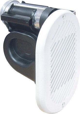 El kompressorhorn med hvidt ASA hus. Omgående lyd ved tryk på horn kontakt (dyb tone). Nem plan montering.