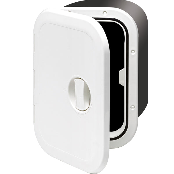 Indbygningsboks med luge inkl. ekstra hængsel, så lugen kan tages helt af. Fås i 3 farver