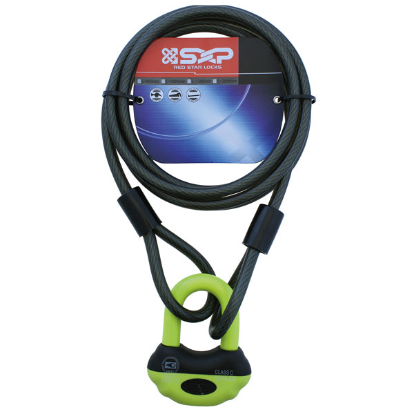 Leveres komplet med en stor og solid bøjlelås i en let synlig farve samt 3 meter plastikbelagt, hærdet stålwire med løkke i begge ender.