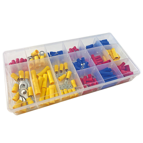 Indeholder: Ringstik, isoleret fladstik, ledningssamler og fladt hanstik. Blå, rød og gul 10 stk af hver model